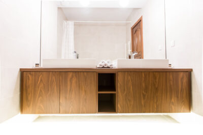 Τα έπιπλα μπάνιου του διαμερίσματος ήταν κατασκευασμένα από κόντρα πλακέ θαλάσσης 22mm σε φυσικές και σκούρες αποχρώσεις , αλλά και λευκές λάκες .