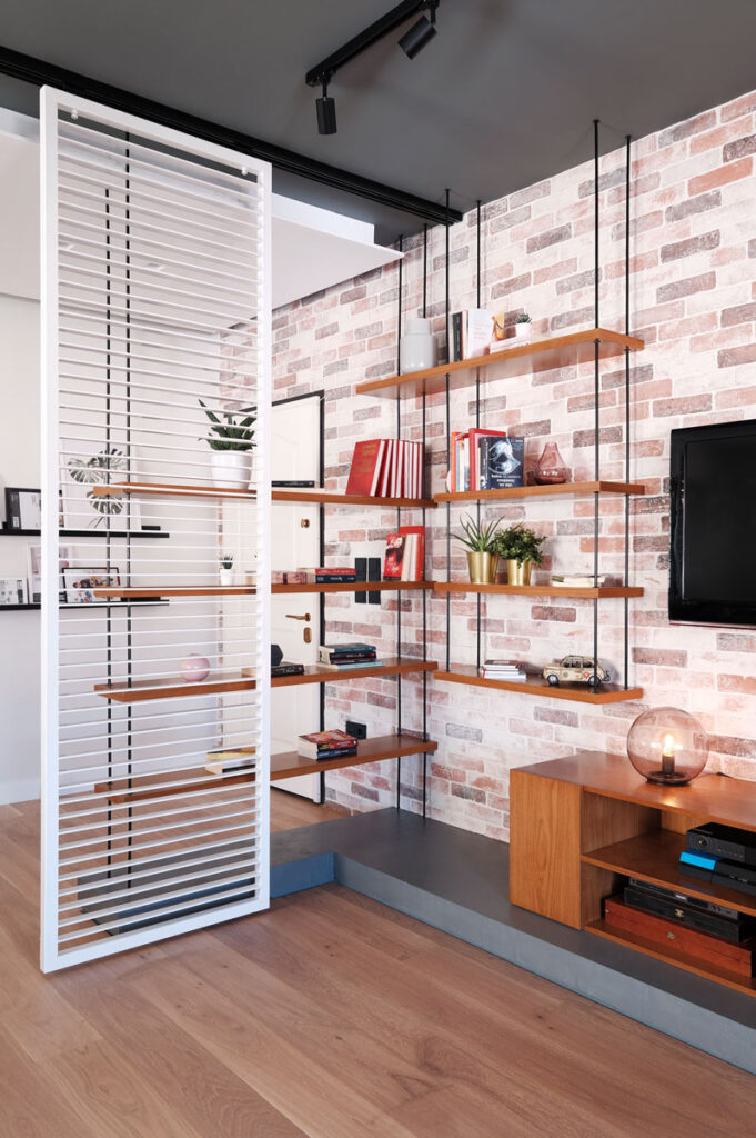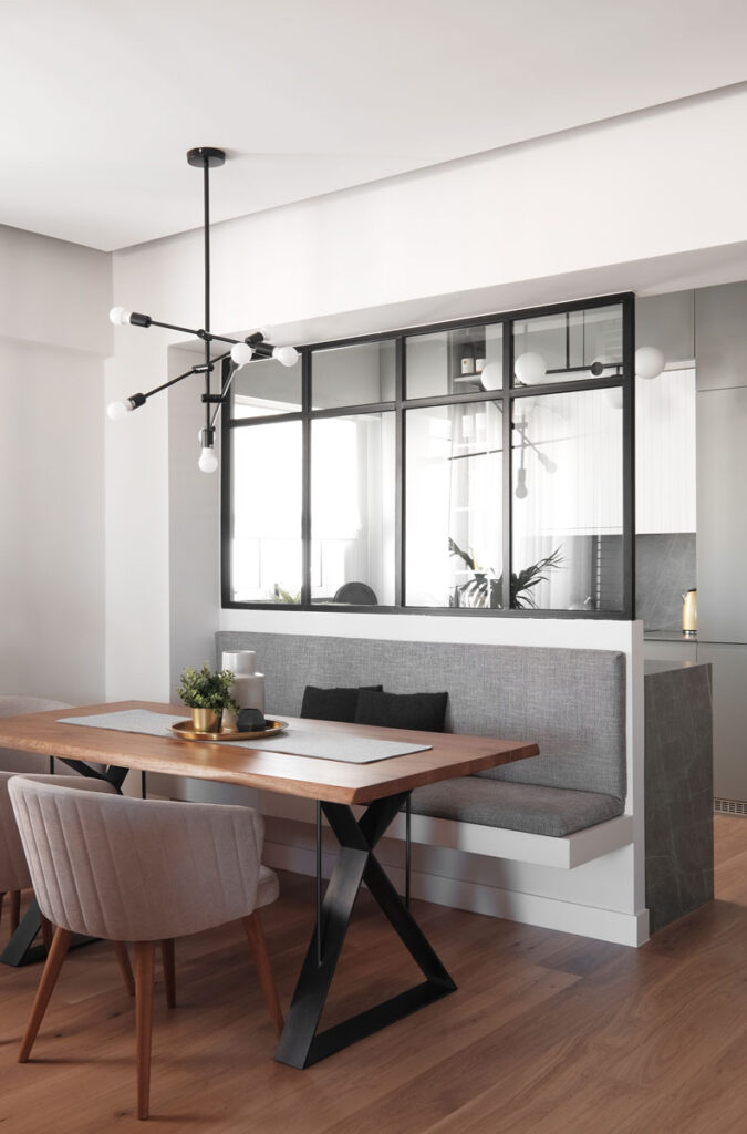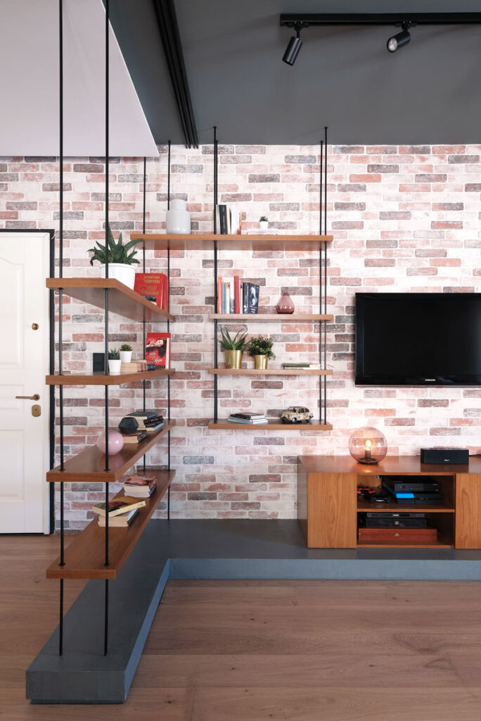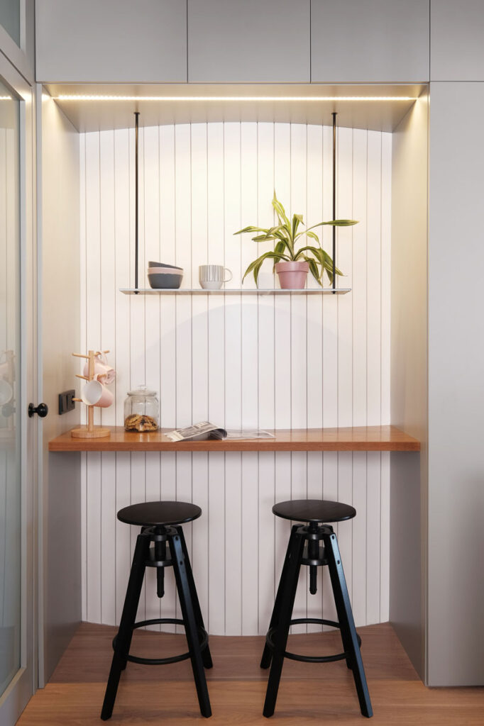 με μια ειδική κατασκευή από ξύλο ραμποτέ λευκής λάκας και δρυς πάγκου.