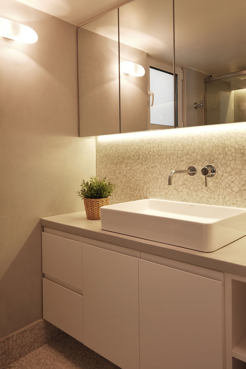 Την ανακαίνιση μπάνιου – έπιπλα από ξύλο δρυ και τις ξύλινες ντουλάπες – κατασκευή από λευκή λάκα επίσης.