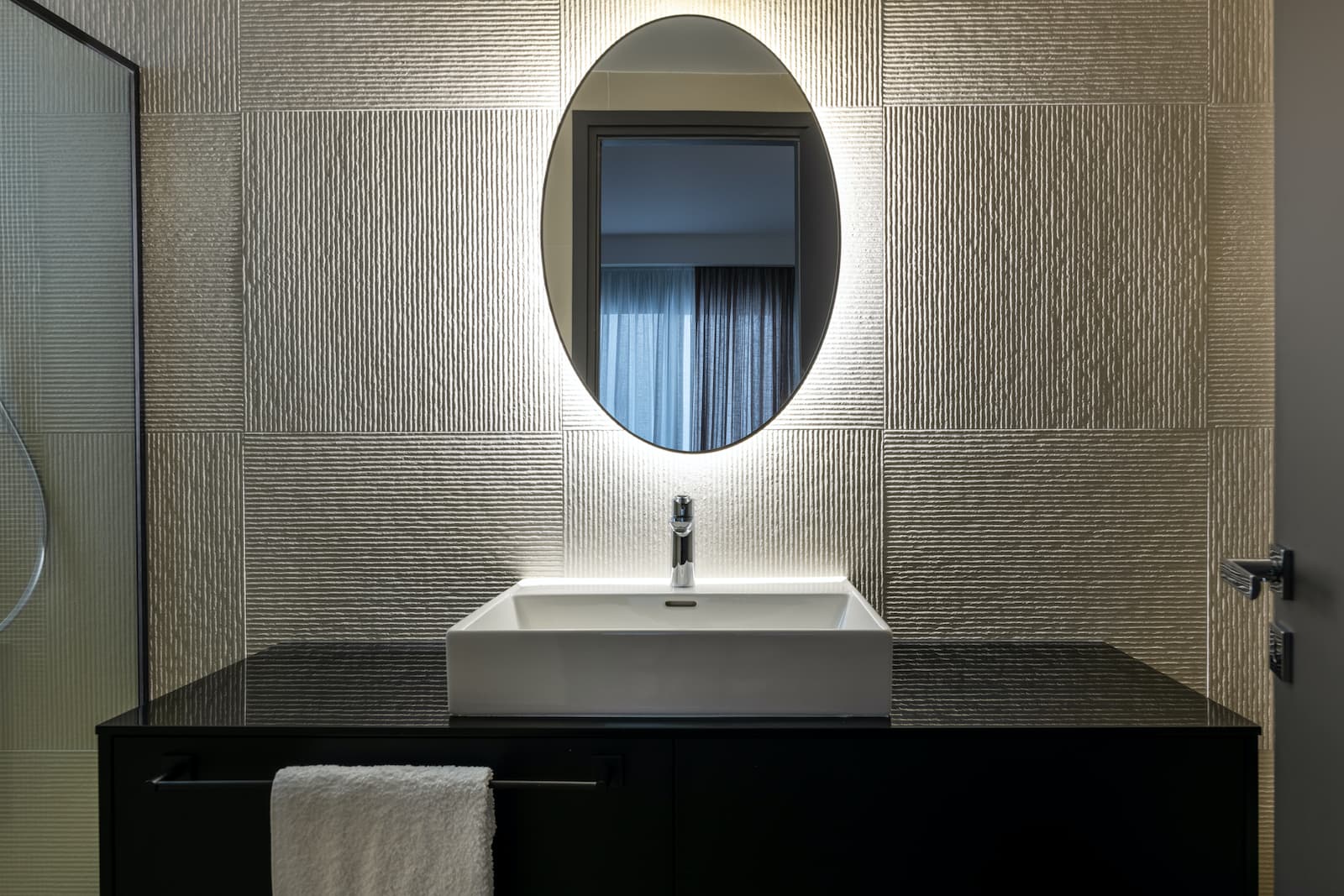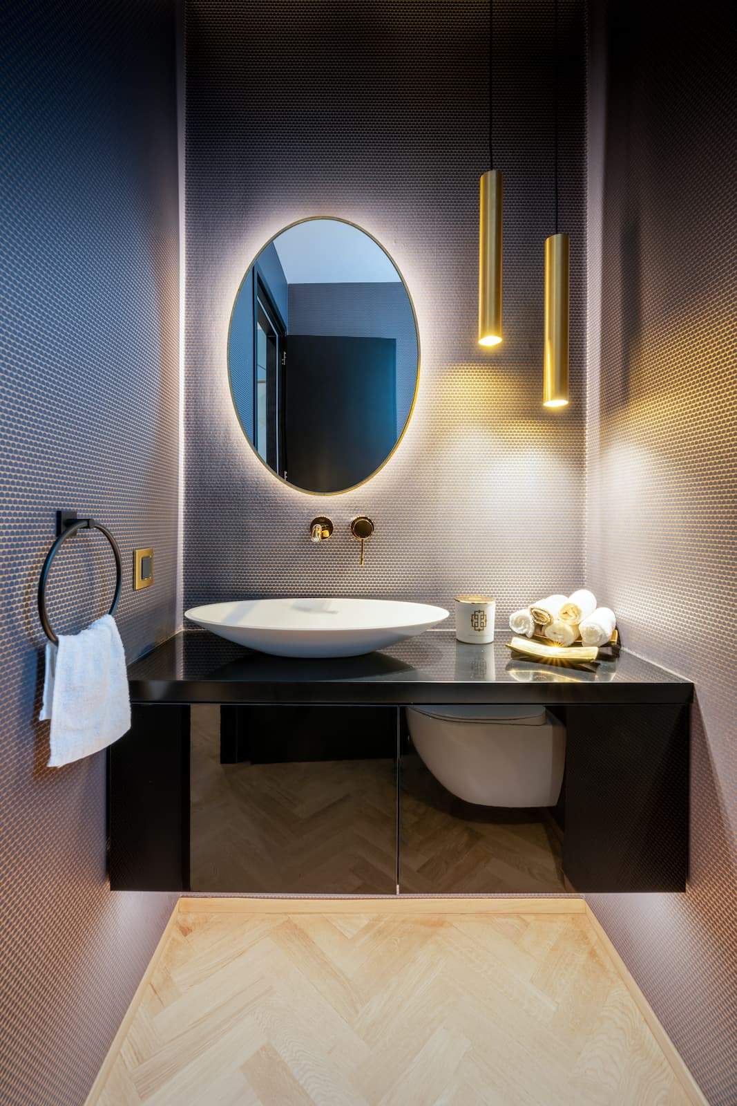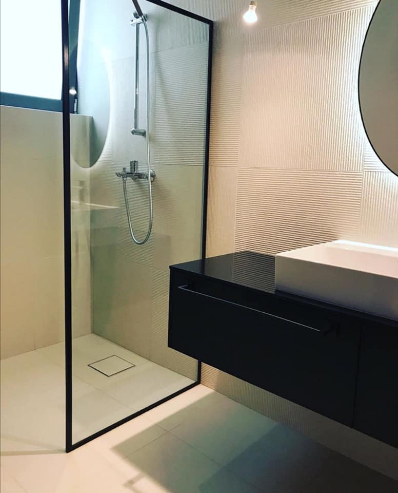 Την ανακαίνιση μπάνιου – έπιπλα φτιαγμένο από μαύρη γυαλιστερή λάκα κόντρα πλακέ θαλάσσης .
