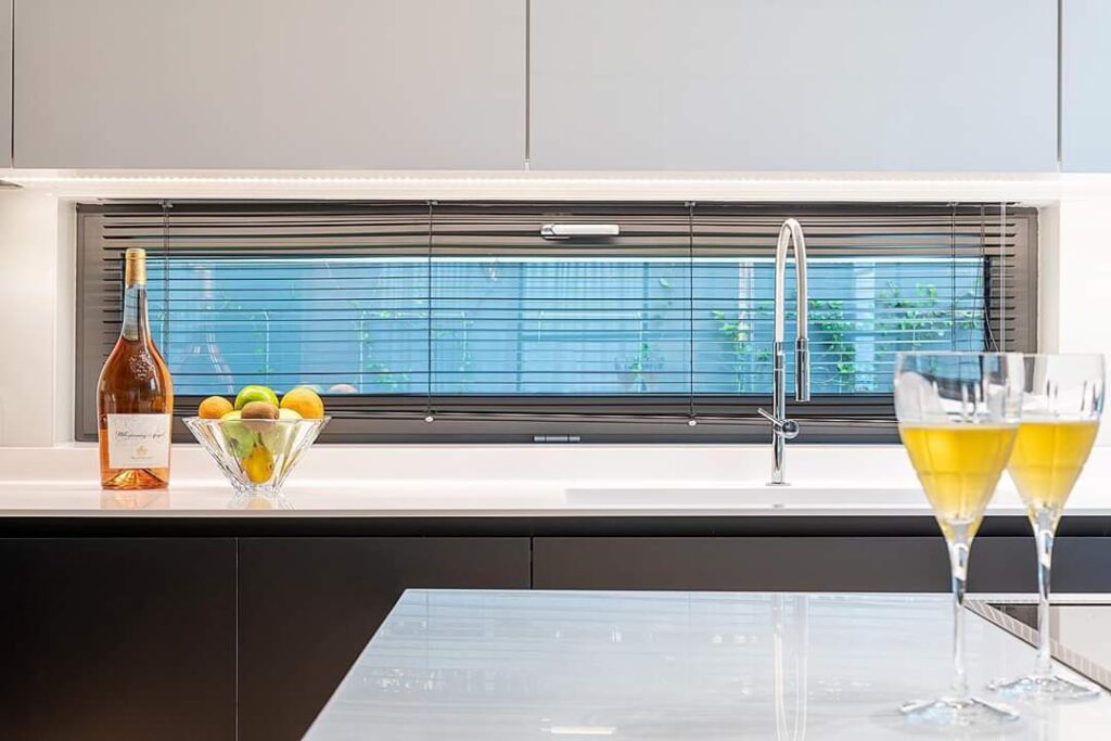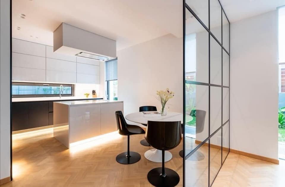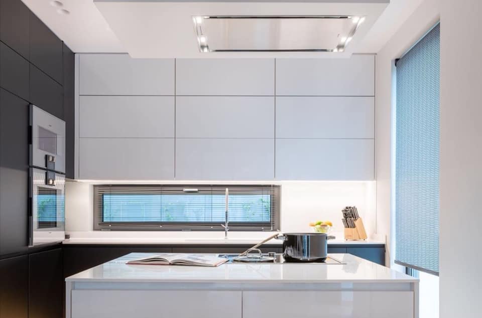 Η εταιρεία μας ανέλαβε τη κατασκευή κουζίνας σε συνδυασμό με γυαλιστερή λευκή λάκα και μαύρο ματ , πάγκο λευκό corian .