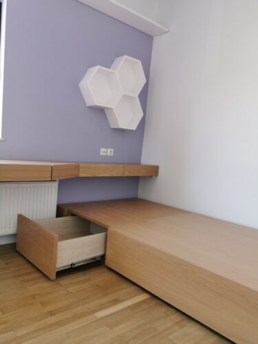 Το κρεβάτι σε συνέχεια με το γραφείο φτιαγμένα από καπλαμά δρυς σε φυσική απόχρωση ,έρχεται να ολοκληρώσει τη κατασκευή μας