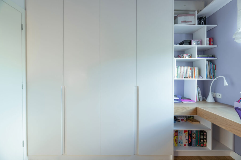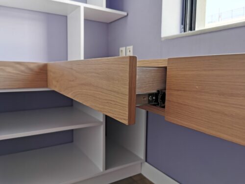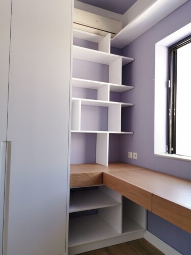 Στο διαμέρισμα που σας παρουσιάζουμε κατασκευάσαμε μια ολοκληρωμένη ειδική κατασκευή από ξύλο. Ένα μεγάλο γραφείο από ξύλο δρυς βαμμένο στη φυσική του απόχρωση ,με συρτάρια και ντουλάπια για να μη πάει κανένας χώρος ανεκμετάλλευτος. Στο δεξί πάνω μέρος τοποθετήθηκαν 3 κυψέλες από λευκή λάκα. Η ντουλάπα και η βιβλιοθήκη είναι από λευκή λάκα επίσης .