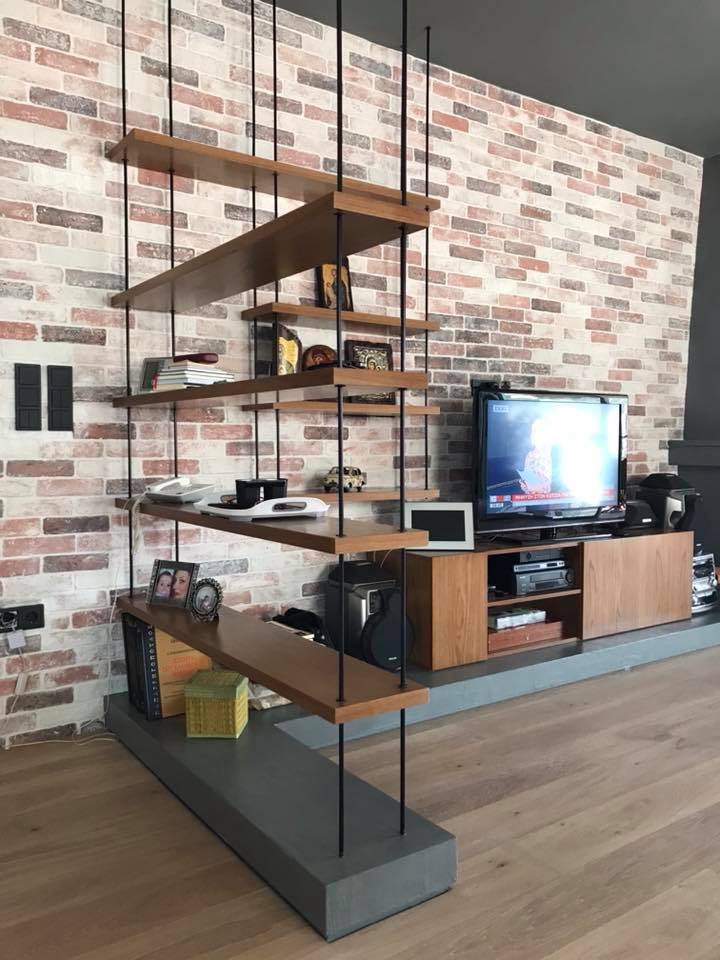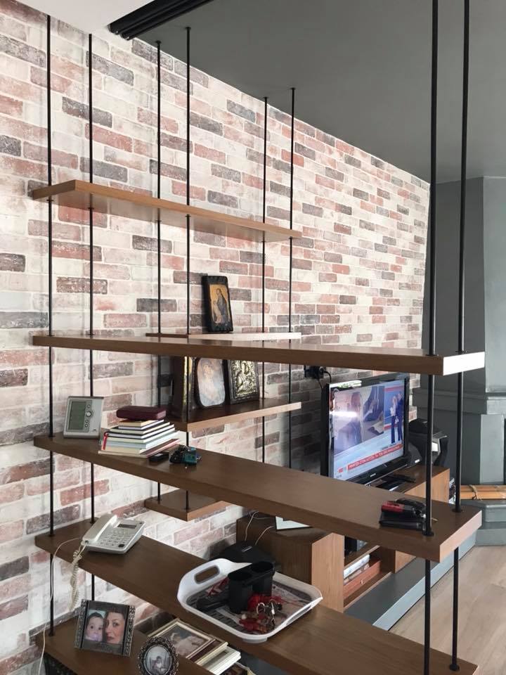 Τοποθετήσαμε τα ξύλινα ράφια μας , φτιαγμένα από μασίφ δρυς σε σκούρο χρώμα καρυδιάς πάχους 4cm , ανάμεσα σε μασίφ γαλβανιζέ ντίζες βαμμένες ηλεκτροστατικά σε μαύρο χρώμα. Οι μαύρες ντίζες κρέμονται από το έδαφος μέχρι το ταβάνι του σπιτιού. Είναι εντυπωσιακό το αποτέλεσμα της σύνθεσης αυτής.
